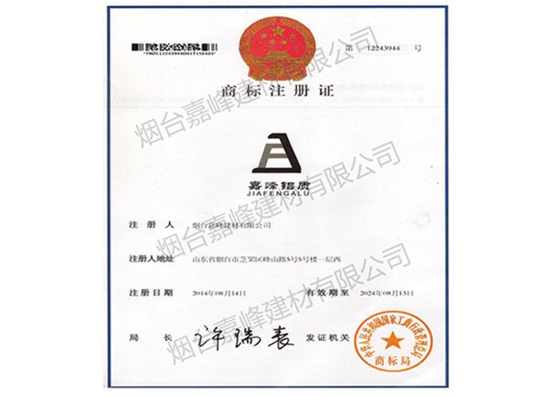 獲批“嘉峰鋁質(zhì)”注冊商標(biāo)