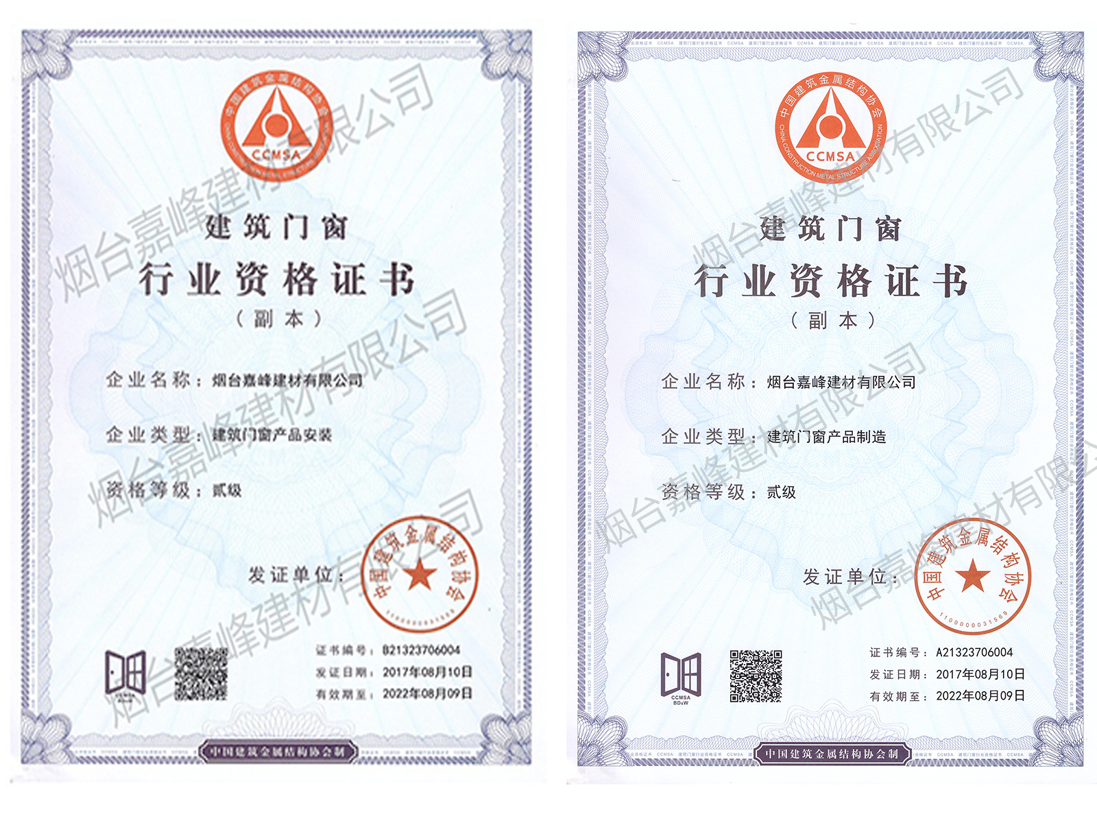 取得山東省新型墻材節(jié)能技術(shù)產(chǎn)品認(rèn)定證書、國家二級建筑門窗產(chǎn)品制造和安裝資格證書